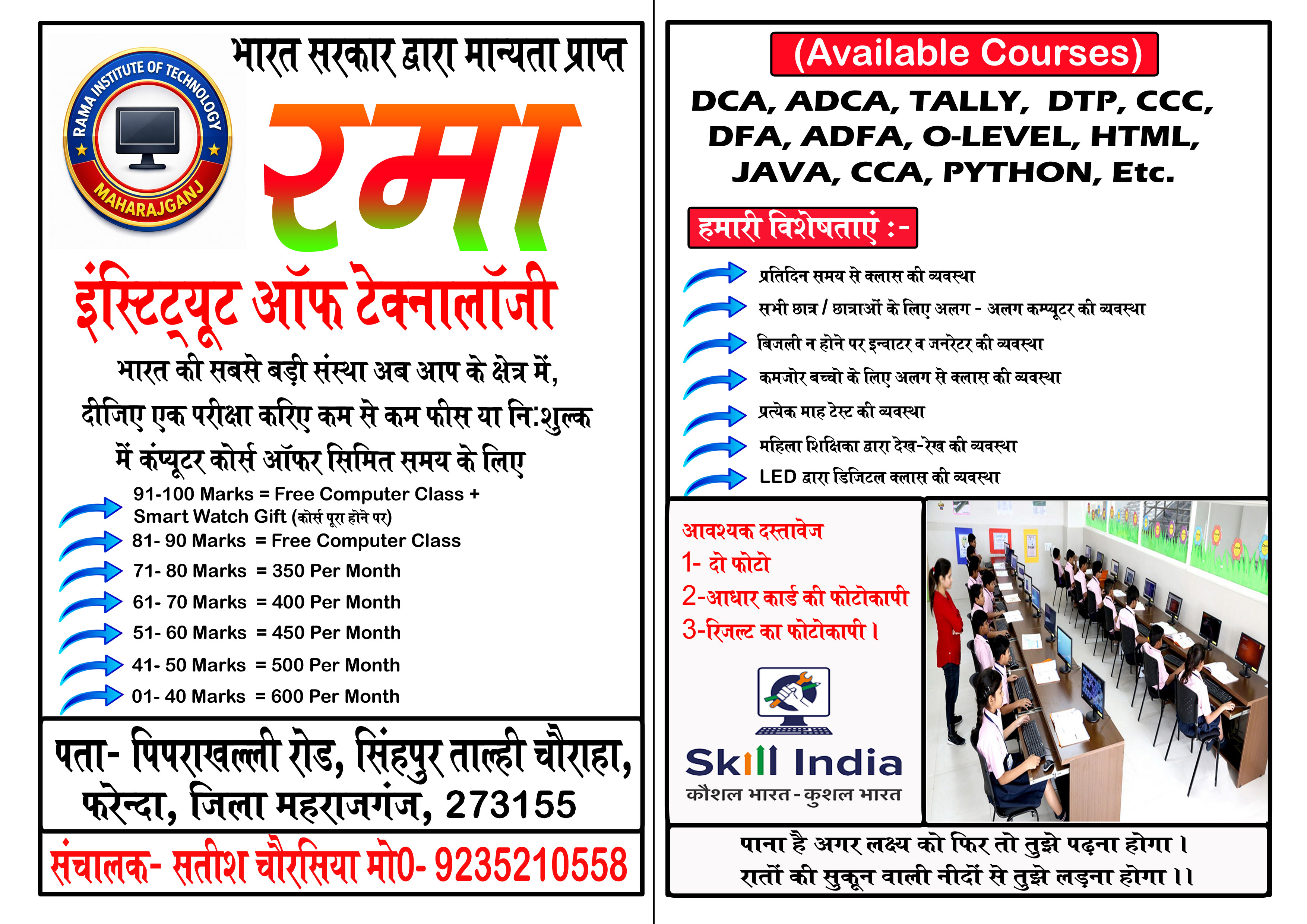 Welcome to RAMA INSTITUTE OF TECHNOLOGY, a premier computer coaching institute dedicated to empowering students with essential digital skills. Our mission is to provide high-quality education in computer literacy, programming, software applications, and advanced IT concepts. Whether you are a beginner or looking to enhance your expertise, our well-structured courses, experienced faculty, and hands-on training ensure a comprehensive learning experience.